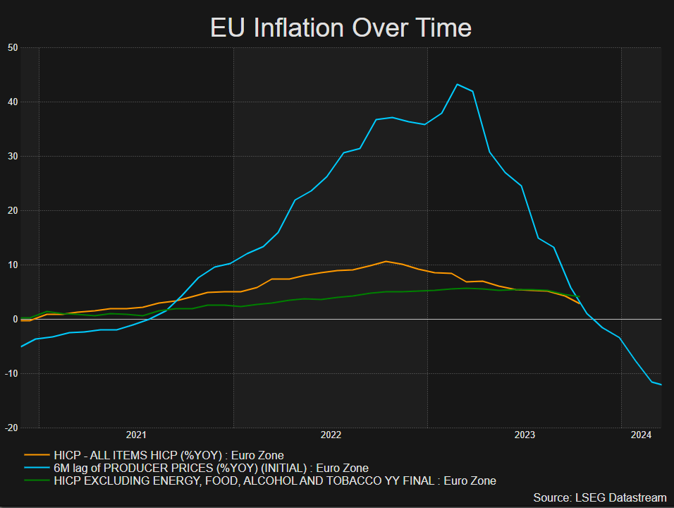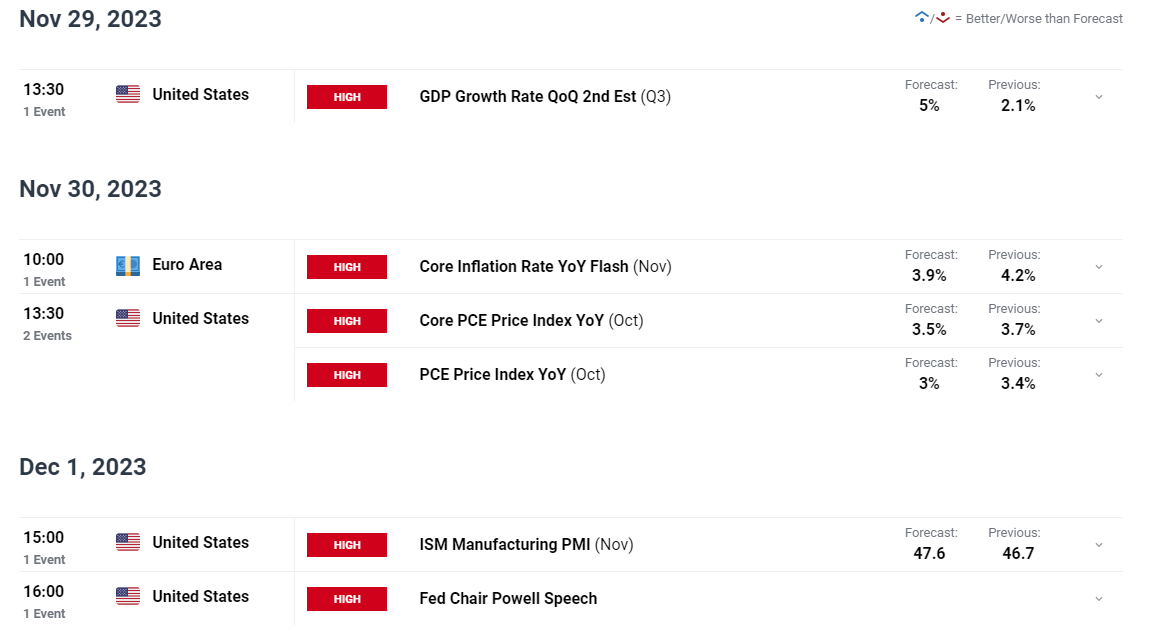 euro/The US dollar found temporary resistance before important data was releasedeuro/dollarCurrently testing 11 month 21 Day high and continue to trade on 200 Daily Simple Moving Average (SMA) upper.Later this week, the bullish trend may faceU.S.AGDPAnother test of the data (second estimate), as the estimate shows that the world's largest economy performed stronger in the third quarter, which may weigh on the euro in the near future/The bullish trend of the US dollar. Better than expected EU inflation data (lower than expected) may also provide a catalyst for a pullback, whileRSIEntering the overbought area soon andMACDOther signs of slowing momentum due to bearish crosses.However, it must be pointed out that neither of these conditions has been met, and in this case, the upward level still exists.Resistance level 1.0960 Rising all the way to 1.1100There is almost no change in the middle.Supporting position1.0831and200Moving average. euro/USD daily chart ![]() Event risk for the remaining time of this weekAccording to advanced data, the annualized growth rate of the US economy is as high as 4.9% Afterwards, in the third quarter of the United States GDP A second estimate will be made.Despite a slowdown in economic data in the fourth quarter, consensus forecasts show slightly higher levels as more data permeates 5% It is predicted that the increase in the third quarter will be limited.If we see an upward correction, the euro/The US dollar may encounter temporary resistance, but consolidation is expected to be brief as more current (weaker) data provides more accurate economic indicators. estimate 11 The monthly EU inflation data will be displayed 11 The month saw another encouraging decline, both in overall indicators and core data (inflation minus volatile energy and food prices).The following chart suggests that compared to other developed countries, the EU's inflation decline rate may be the fastest.Producer price inflation measures the upstream price trend at the factory entrance, ultimately resulting in a value of approximately 6 The lag time of one month permeates into a wider range of economic sectors.PPI Severe negative values (deflation) indicate that more widely followed inflation measures may soon emerge, which will force the European Central Bank to seriously consider lowering interest rates to revive a weak economy.In the long run, as the interest rate spread widens, this result will lead to a weakening of the euro. EU Inflation (Title HICP Inflation, Core HICP Inflation and PPI) ![]() Source:TradingViewRichard Snow (Richard Snow)write ![]() |