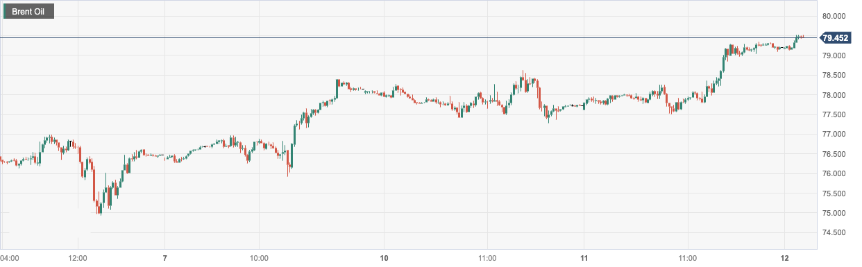 Brent crude oil rose to79.45附近,因全球大型石油出口国削减供应,使得油价获得上行提振。
