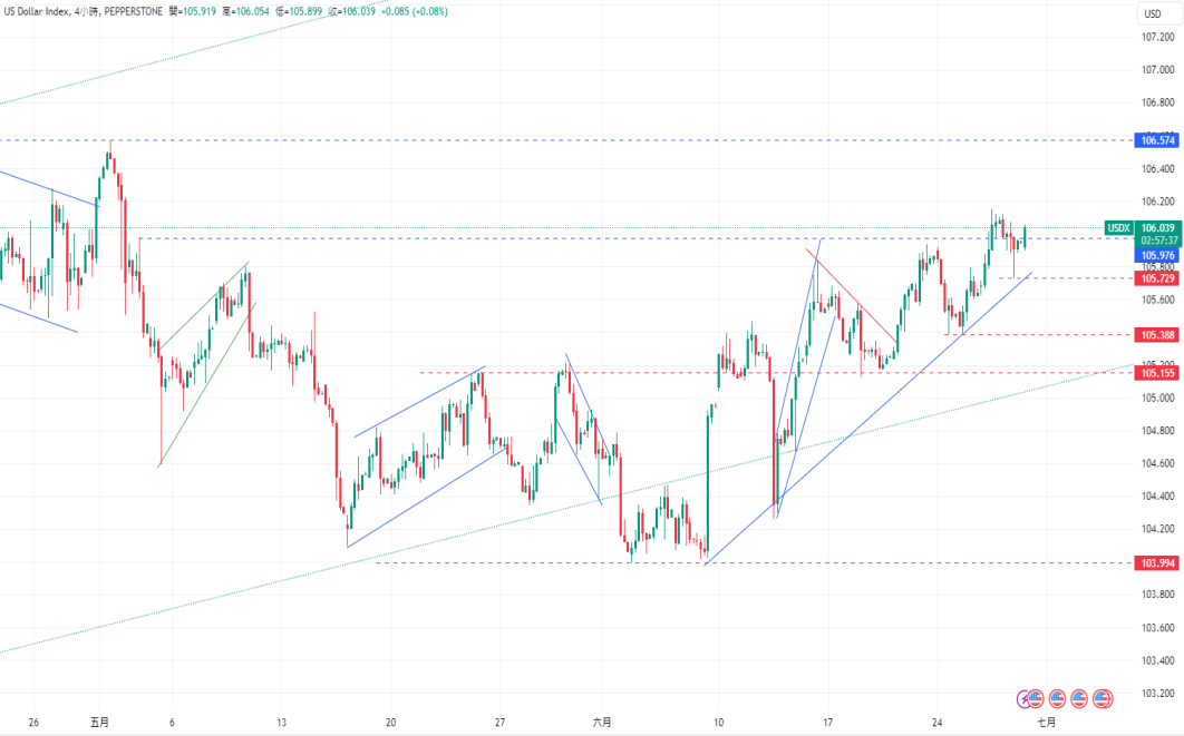 Technical analysis: 美元指数走势自6month7日起有着低点越来越高的上行倾向,只要继续维持在趋势线上方进行交易,美元指数的多头就有望以106.57为下一个目标。